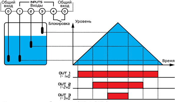 Работа выходов сигнализатора уровня ELV3 определяется уровнем воды в переливной емкости, согласно представленной ниже диаграмме: