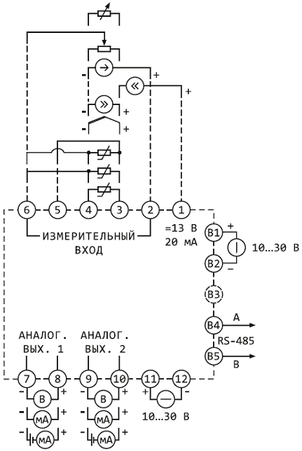 Универсальный измерительный вход позволяет подключать термопреобразователи сопротивления, термопары, токовые шунты, унифицированные токовые сигналы и сигналы напряжения, потенциометры и сопротивления.