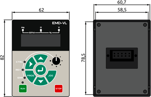 ПЧ серии EMD-VL оборудованы съемным штатным пультом и поставляются с кабелем 2 метра в комплекте. У ПЧ серии EMD-VH пульт не съемный, но возможно подключение внешнего пультам EMD-V-RCP, который заказывается отдельно. Внешний пульт имеет щитовое исполнение для установки на дверь шкафа.
