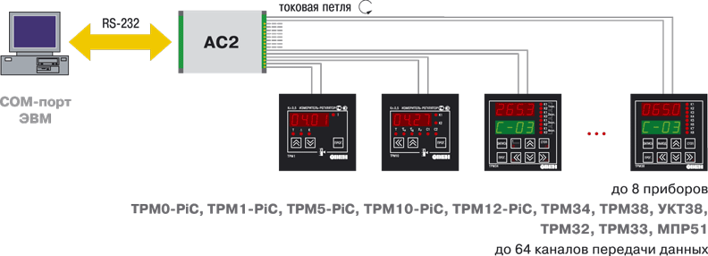 Через преобразователь АС2-М прибор подключается к сети RS-485, которая, в свою очередь, через адаптер АС3-М, АС3 или АС4 может быть подключена к ПК. К каждому преобразователю АС2-М подключается один прибор типа ТРМ1-PiC, ТРМ38, МПР51 и т. п. Максимальное количество каналов отображения для одного порта (при использовании восьмиканальных приборов типа УКТ38 или ТРМ38) равно 256.