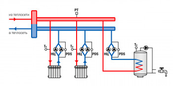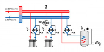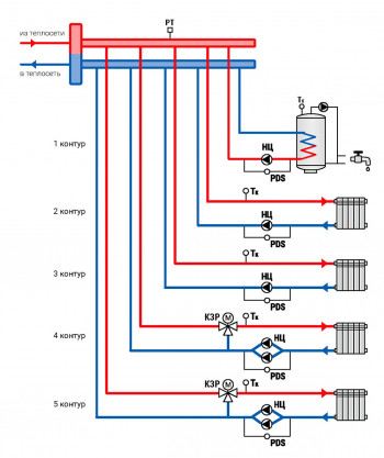 Схема многоконтурной системы отопления прямых и смесительных контуров с бойлером ГВС