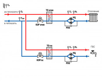 | Тп | Датчик температуры теплоносителя в подающем общем трубопроводе | КЗР отоп | Клапан запорно-регулирующий контура отопления |