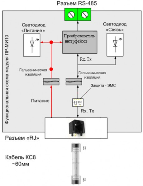 Шина связи модуля и ПР110 имеет гальваническую развязку с портом интерфейса RS-485. Питание модуля происходит непосредственно от внутреннего источника ПР110, поэтому модуль может применяться как с модификациями реле на 220 так и на 24 В.