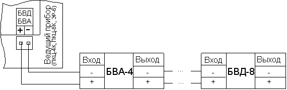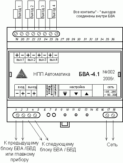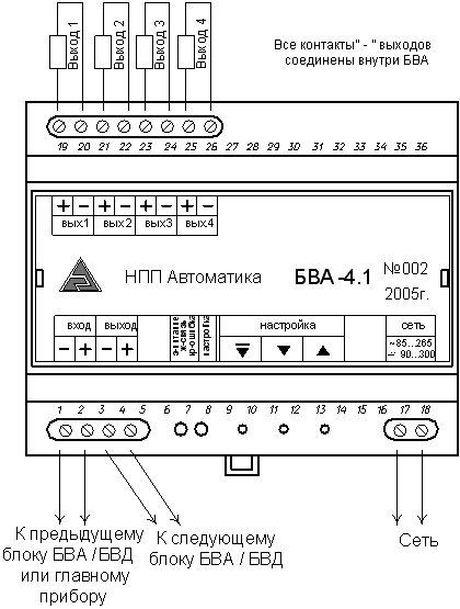 Ввод сигналов в блок БВА-4-2 производится по специальному интерфейсу от приборов производства НПП <Автоматика> (ПКЦ-4К, ПКЦ-8К, ЭР-6 и др.). Допускается последовательное подключение нескольких блоков аналогового вывода БВА и дискретного вывода БВД к одному главному прибору, при этом установка адресов пользователем не требуется. Максимальное количество блоков определяется главным прибором. Состояние выходов обновляется 1 раз в секунду; при отсутствии связи с главным прибором в тече-