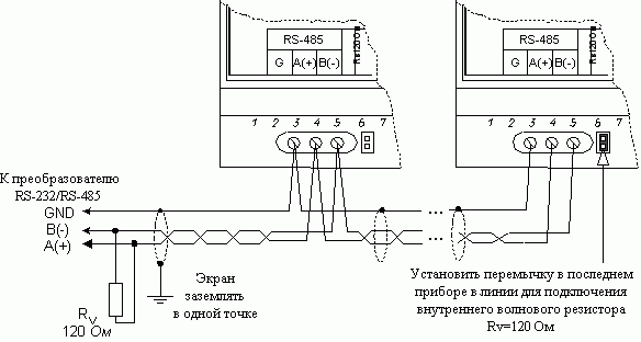 Рис. 3. Схема подключения интерфейса RS485 для ввода сигналов в блок БВА-4.1 |