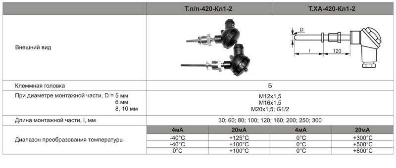 Датчики температуры жидкости и сыпучих сред Т.п/п-420-Кл1-2, Т.ХА-420-Кл1-2