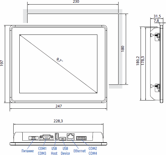 Габаритные размеры и размеры монтажного отверстия и расположение клеммных колодок и портов сенсорной панели оператора ECP-10, мм