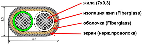 Гибкий высокотемпературный термокомпенсационный кабель K-FB-FB-SSB-2*0,5