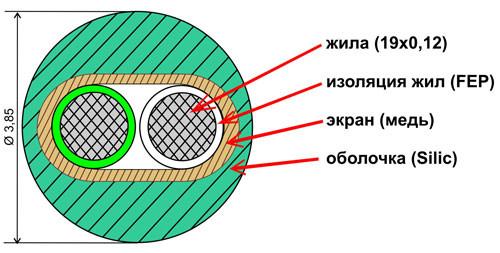 - Конструкция жилы 19/0,12 мм (19 проволок диаметром 0,12 мм)