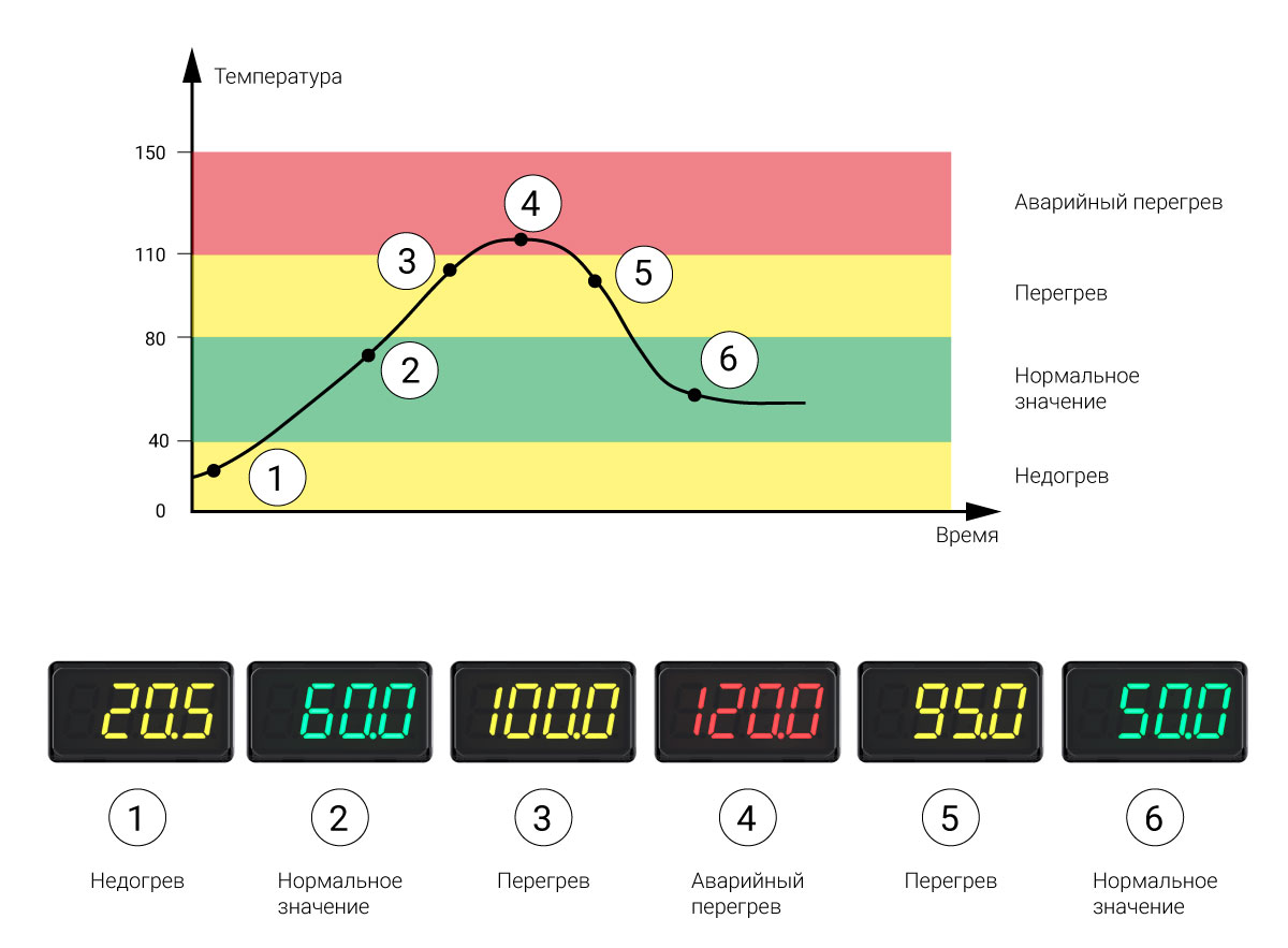 Наглядное оповещение о состоянии измеряемой величины в ИТП-17 сопровождается автоматической сменой цвета. Рассмотрим пример настройки цветовой сигнализации процесса нагрева. Определено четыре события: норма, недогрев, перегрев и аварийный перегрев. Для каждого события предназначен свой цвет индикатора.