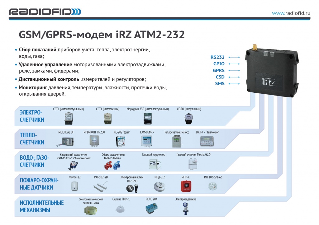 Серия ATM - промышленные 3G/GSM/GPRS-модемы с поддержкой двух SIM-карт, интерфейсами RS-232, RS-485 (RS-422) выводами GPIO. Модемы ATM могут работать в любом из трех режимов: “Клиент”, “Сервер” или “Только CSD”. В режиме “Клиент” модем подключается к серверу сбора данных и передает ему информацию с внешнего устройства. В режиме “Сервер” модем, наоборот, сам ожидает входящее подключение клиента (например, с компьютера диспетчера) на определенном порту и обрабатывает его. В режиме “Только CSD” передача данных выполняется по CSD (голосовому каналу). Модем настраивается с помощью программы ATM Control, для централизованного сбора информации используется программное обеспечение iRZ Collector. Перезагрузка GSM-модуля происходит по звонку, по SMS, либо от настраиваемого сторожевого таймера.Две SIM-карты дают возможность резервирования операторов связи. АТМ3-232 отличается интерфейсом (RS-232) и стандартом связи (3G/GSM/GPRS).