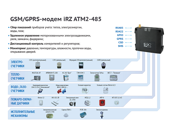 Серия ATM - промышленные 3G/GSM/GPRS-модемы с поддержкой двух SIM-карт, интерфейсами RS-232, RS-485 (RS-422) выводами GPIO. Модемы ATM могут работать в любом из трех режимов: “Клиент”, “Сервер” или “Только CSD”. В режиме “Клиент” модем подключается к серверу сбора данных и передает ему информацию с внешнего устройства. В режиме “Сервер” модем, наоборот, сам ожидает входящее подключение клиента (например, с компьютера диспетчера) на определенном порту и обрабатывает его. В режиме “Только CSD” передача данных выполняется по CSD (голосовому каналу). Модем настраивается с помощью программы ATM Control, для централизованного сбора информации используется программное обеспечение iRZ Collector. Перезагрузка GSM-модуля происходит по звонку, по SMS, либо от настраиваемого сторожевого таймера.Две SIM-карты дают возможность резервирования операторов связи. АТМ2-485 отличается интерфейсом (RS-485) и стандартом связи (GSM/GPRS).