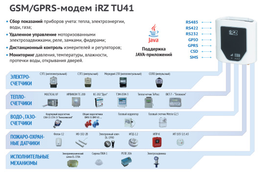 TU41 – индустриальный 3G-модем, для передачи данных по сетям сотовой связи, используется для промышленного внедрения M2M-решений. В устройстве предусмотрены всевозможные интерфейсы подключения дополнительного оборудования, есть выводы для датчиков. В модем можно загрузить любое Java-приложение, есть возможность питания по USB, без блока питания.