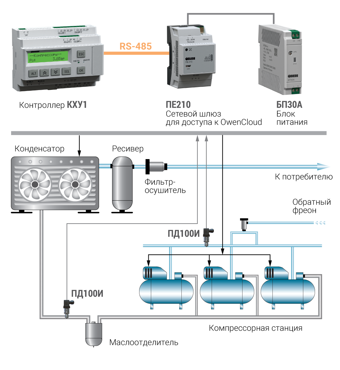 КХУ1 управляет производительностью группы компрессоров и ступеней конденсатора для поддержания заданных значений давления всасывания и конденсации. -