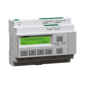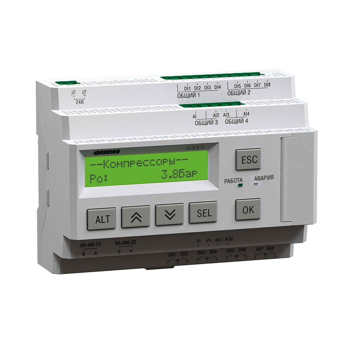 Прибор поддерживает управление холодильной централью, состоящей максимум из 8 компрессоров и 8 ступеней конденсатора. -