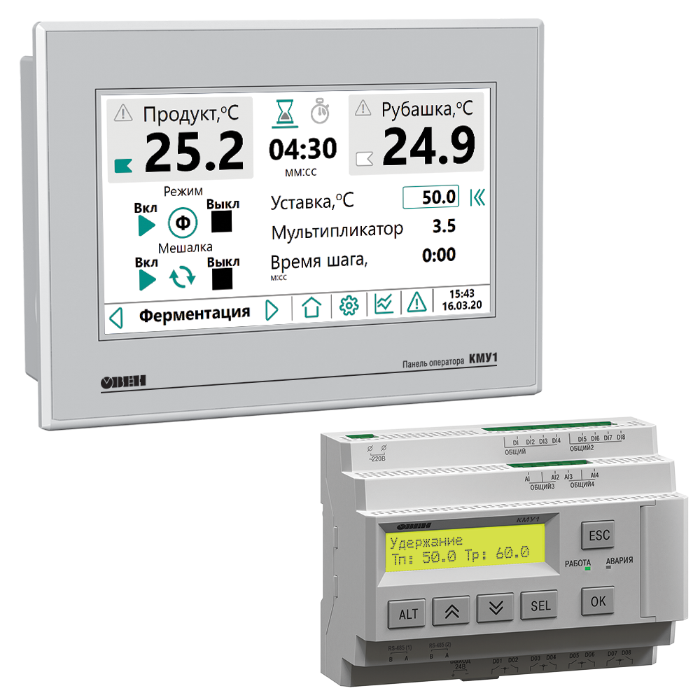- КМУ1-24.СВ.К – комплект панели и регулятора с питанием 24 В обоих приборов с алгоритмами сыроварни (КМУ1-24.СВ.Р + КМУ1-24.СВ.П)