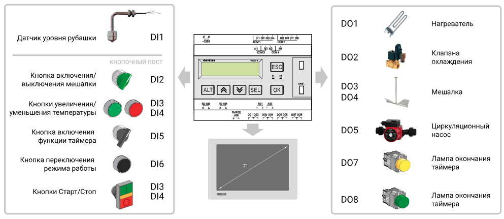 - Управление мешалкой с функцией реверса (через ПЧ или контактор).