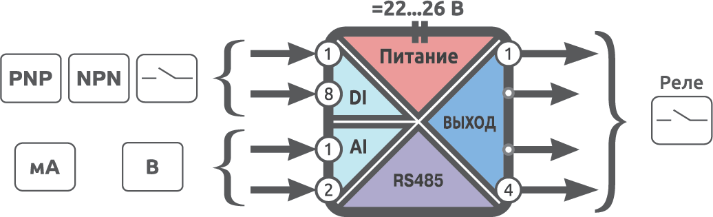 | 8 дискретных входов и 4 дискретных выхода релейного типа | 8/4R | ||||
