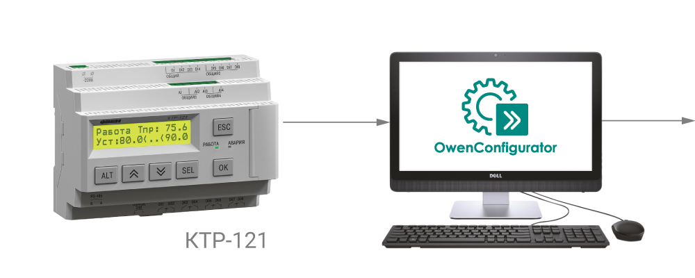 Контроллер КТР-121 можно настроить как с панели прибора, так и с использованием ПК в Owen Configurator. Подключение прибора осуществляется с помощью кабеля miniUSB. Конфигуратор позволяет обновлять встроенное ПО контроллера, записывать и читать значения параметров. Готовую конфигурацию можно сохранить на ПК и дублировать ее в другие аналогичные контроллеры при необходимости. Также в конфигураторе есть возможность отслеживать изменения параметров в режиме «реального времени».