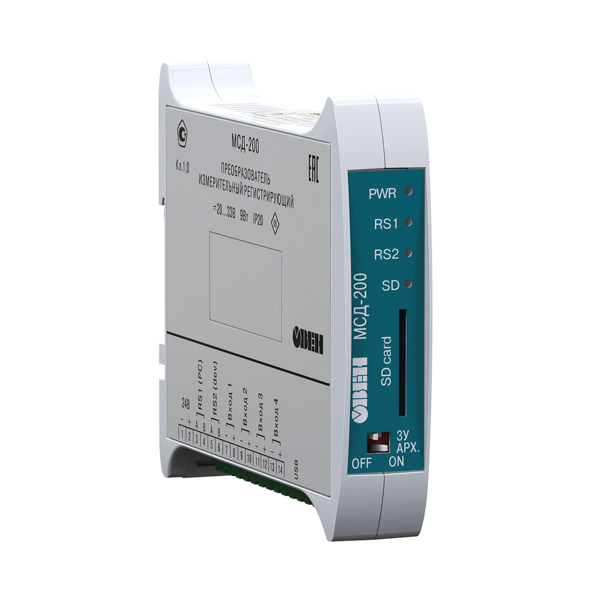 Модуль сбора данных ОВЕН МСД-200 применяется для опроса\прослушивания приборов, модулей ввода, контроллеров имеющих возможность передавать данные в сеть RS-485. Производит архивирование данных полученных с 64 точек измерения на карту памяти SD.