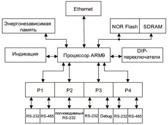 - 2 универсальных последовательных интерфейса RS-232/RS-485, режим работы определяется при помощи встроенных DIP-переключателей