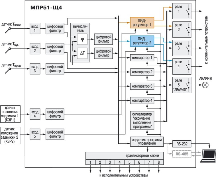 МПР51-Щ4 имеет в своем составе 2 ПИД-регулятора, которые обеспечивают точное поддержание любых двух из пяти измеренных и вычисленных параметров: Тсух, Твлаж, Тпрод,
