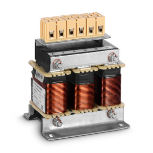 Сетевой дроссель подключается ко входу преобразователя частоты и является двухсторонним буфером между ним и сетью электроснабжения. Установка сетевого дросселя рекомендуется, если мощность источника питания (распределительного трансформатора) более 500 кВА, либо превышает в шесть и более раз мощность электропривода, либо если длина кабеля между источником питания и преобразователем частоты менее 10 м.