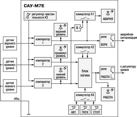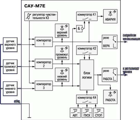 Прибор САУ-М7Е обеспечивает контроль уровня жидких или сыпучих материалов в резервуаре. Может управлять заполнением, осушением или поддержанием уровня в отопительных котлах, водонапорных башнях, зернохранилищах и т.п.