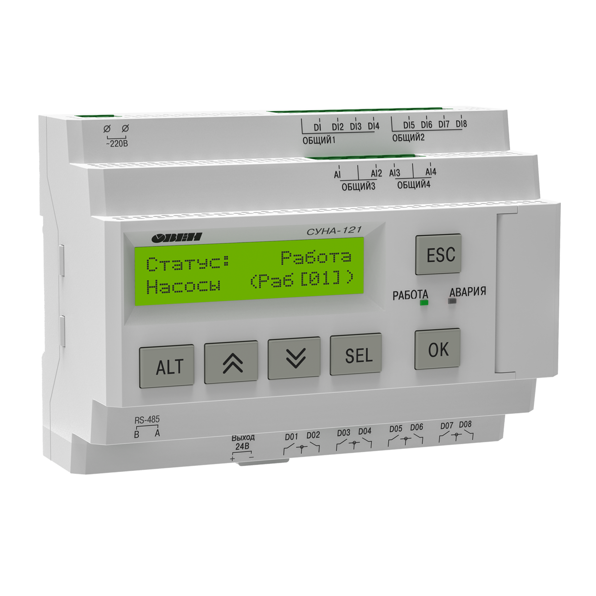 СУНА-121 - контроллер с готовыми алгоритмами для управления насосными группами. Предназначен для применения в системах водоснабжения, водозабора, повышения давления, канализационных сооружений и прочих объектов, на которых требуется управление насосами.