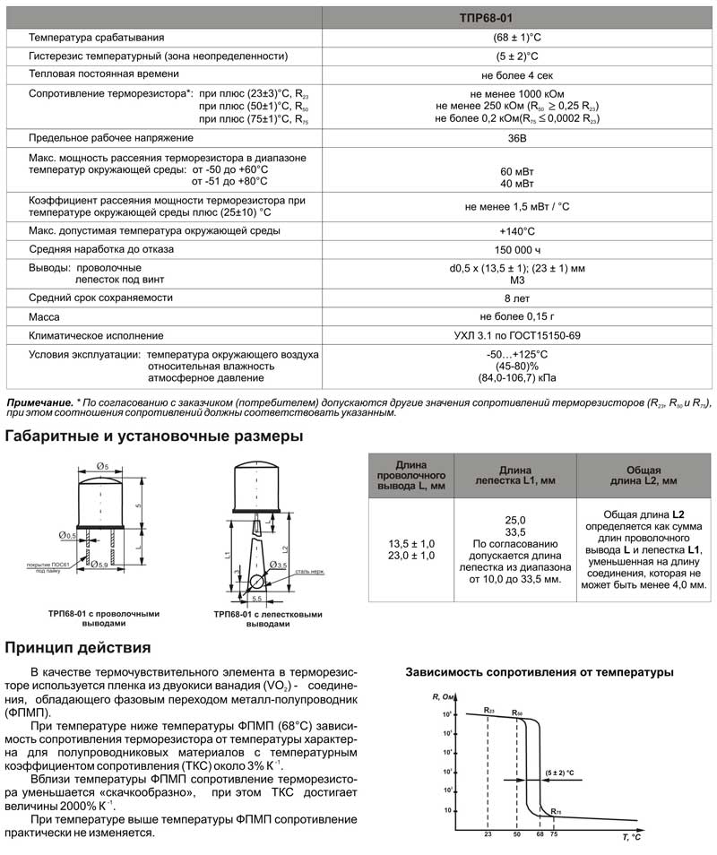 Релейная зависимость сопротивления от температуры. Металлостеклянный корпус (КТ1) d 4,8 х 5 мм; Тср. 68°С с отклонением ±1°С; гистерезис 3…7°С; сопротивление: при 20°С не менее 1МОм, при 55°С не менее 250 кОм, при 75°С не более 0,2 кОм; номинальная мощность рассеяния 1,5 мВт, макс. мощность 60 мВт; выводы проволочные d 0,5 х 13, 5; 23 мм или лепестковые под винт М.