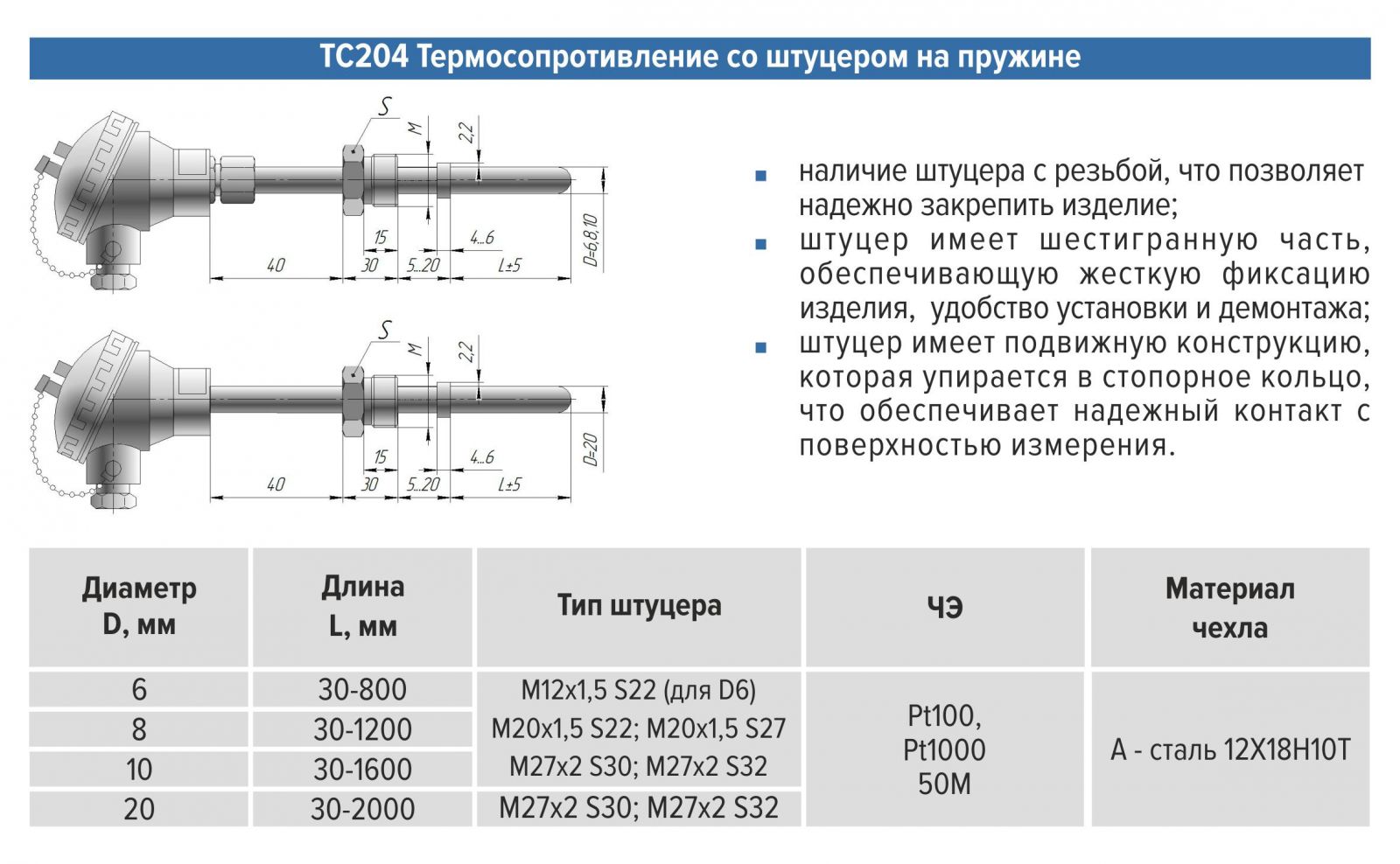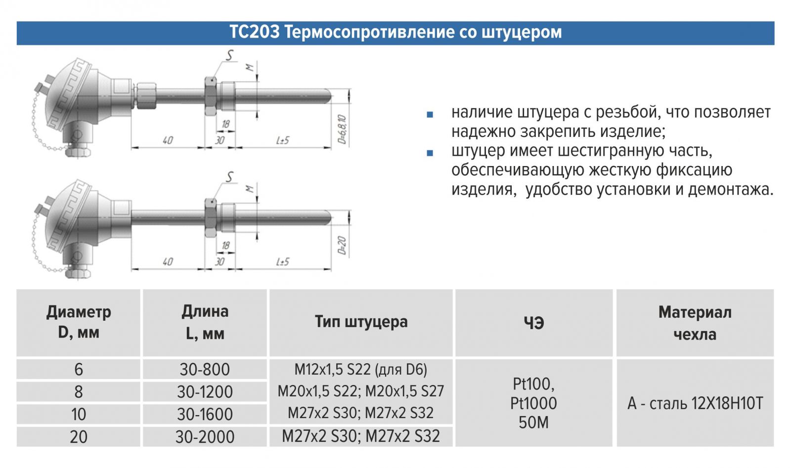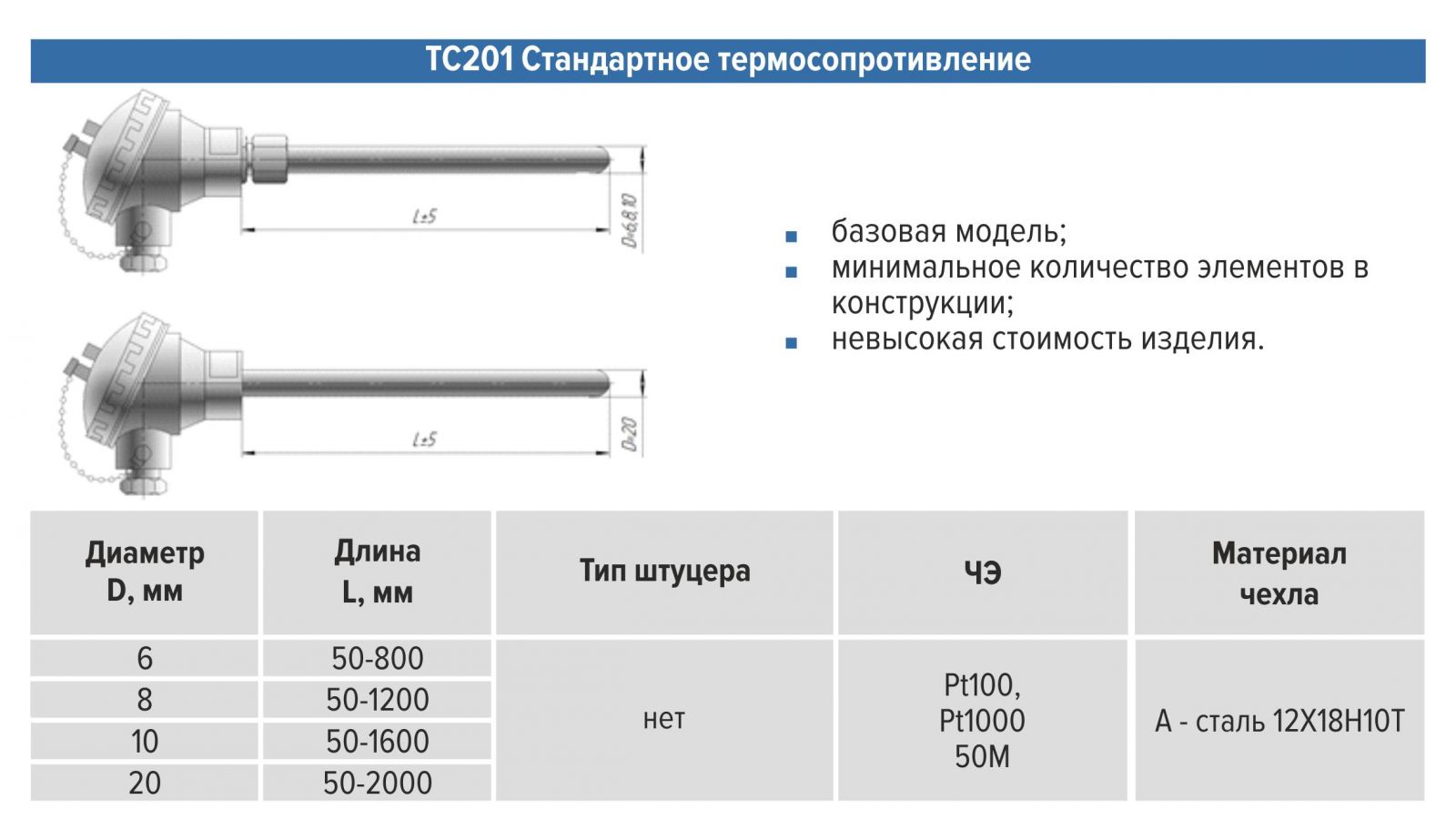 Серия термосопротивлений с коммутационной головкой. Отличительная особенность всех моделей данной серии в наличии алюминиевой коммутационной головки, которая дает более высокий уровень персонализации монтажа термосопротивления для пользователя. У моделей с диаметром рабочей части менее 20 мм крепление коммутационной головки выполнено через переходной штуцер, что обеспечивает устойчивую и надежную конструкцию изделия.