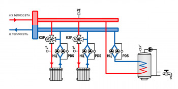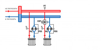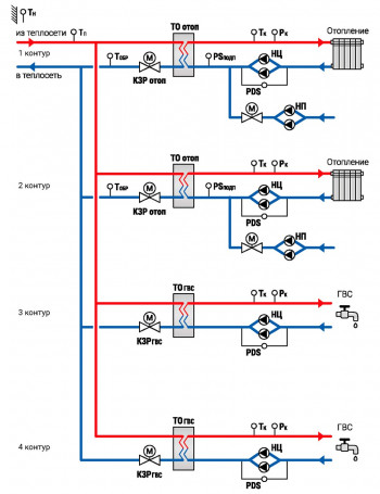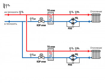 | Тп | Датчик температуры теплоносителя в подающем общем трубопроводе | КЗР отоп | Клапан запорно-регулирующий контура отопления |