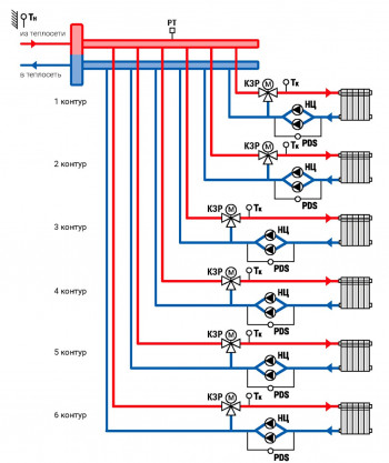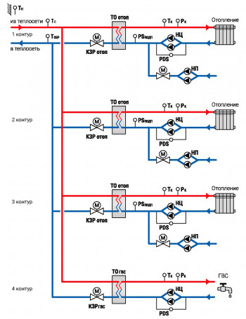Схема многоконтурной системы отопления прямых и смесительных контуров с бойлером ГВС