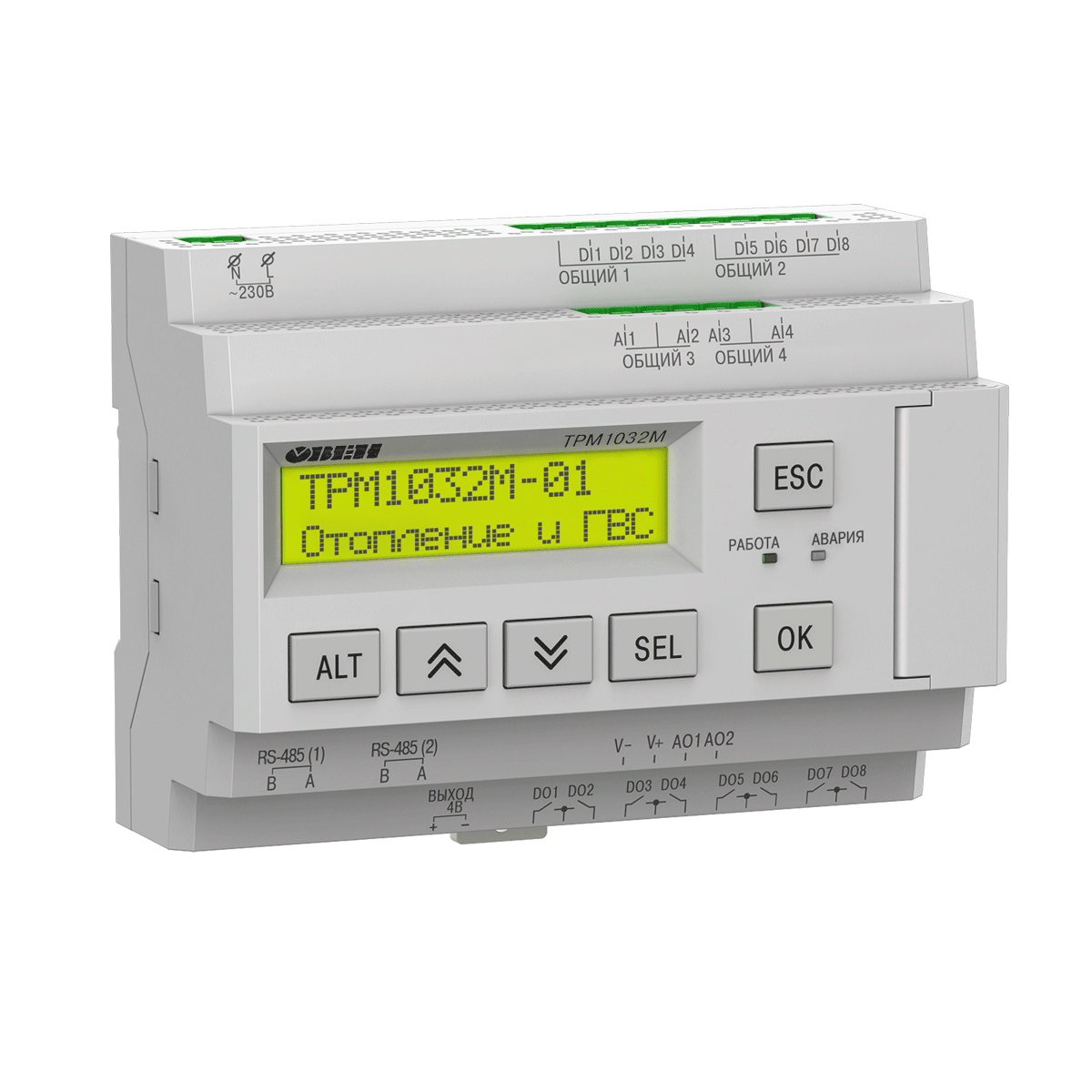 ТРМ1032 - контроллер с готовым алгоритмом регулирования температуры в системах отопления и ГВС. Предназначен для применения в индивидуальных и центральных тепловых пунктах (ИТП и ЦТП) и котельных. Регулятор отопления и ГВС поддерживает температуру по заданной уставке или отопительному графику, управляет запорно-регулирующим клапаном (КЗР), циркуляционными насосами, поддерживает давление системы, управляя контуром подпитки.