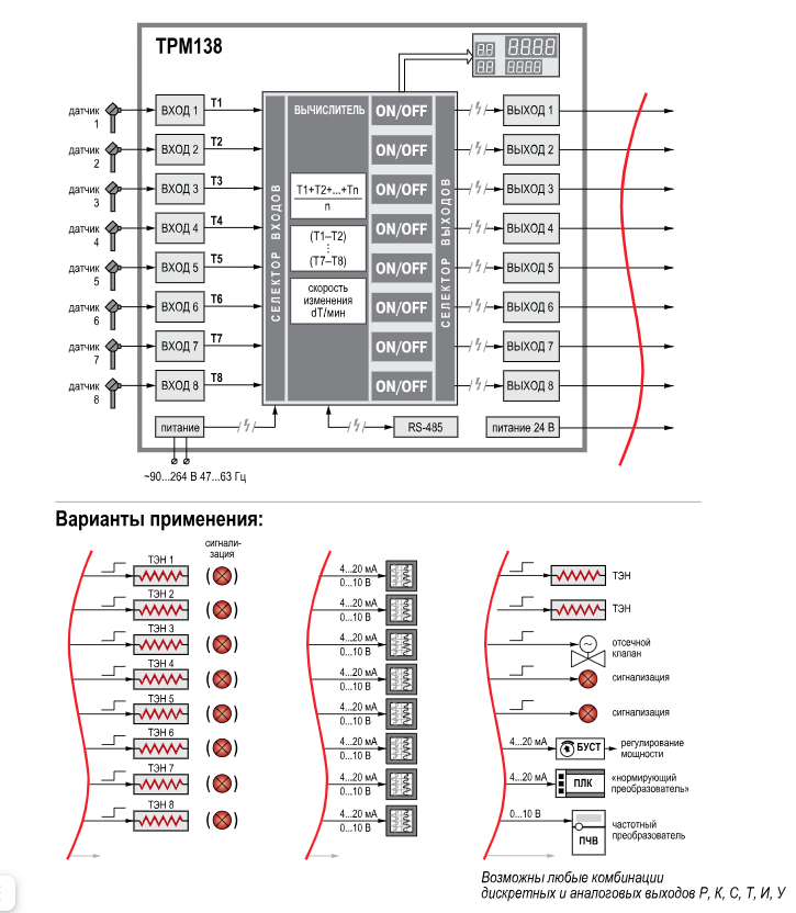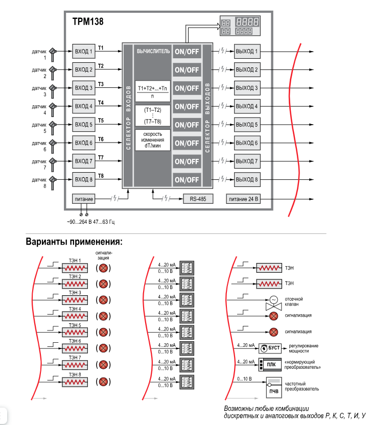 К восьми универсальным входам ТРМ138 могут быть подключены датчики разного типа в любой комбинации, что позволяет одновременно измерять и контролировать несколько различных физических величин.