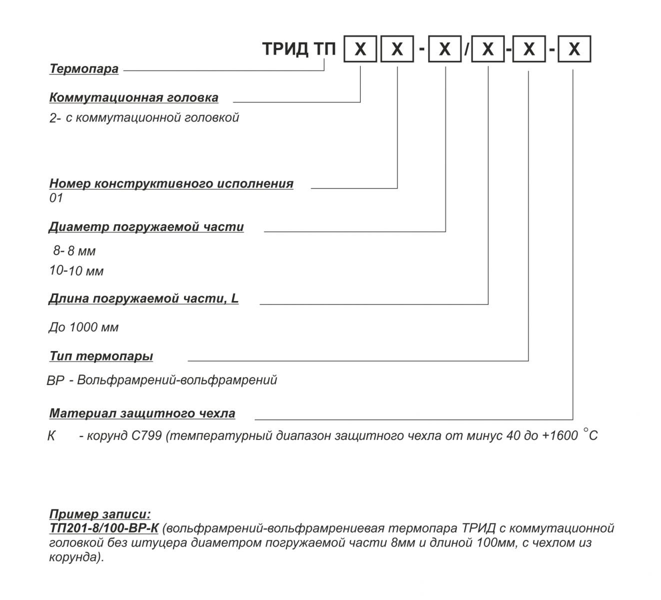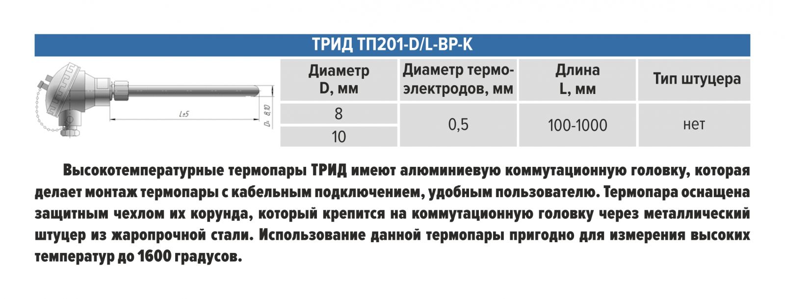 Серия высокотемпературных термопар. Их отличительная особенность в том, что защитный чехол выполнен из высококачественной газоплотной керамики марки С799, способной выдерживать высокие рабочие температуры. Модельный ряд термопар серии ТРИД-К представлен в трех вариантах конструктивных исполнений с варьирующимися габаритными размерами. Опционально термопары могут быть укомплектованы термопарными разъемами (штекерами).
