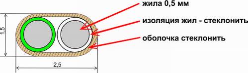 - Цвет изоляции жил: (+) провод – зелёный, (-) провод – белый