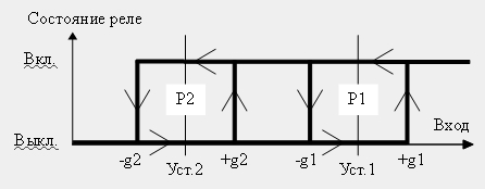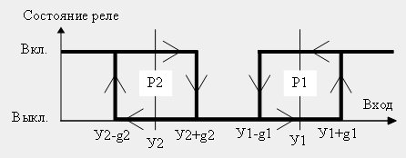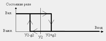 Рис. 2. Сигнализация "ниже уставки У2" с гистерезисом ±g2 (двухпозиционный регулятор)